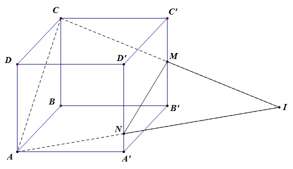 Mặt phẳng $(P)$ cắt mặt phẳng $A’B’C’D’$ theo giao tuyến song song với $AC$ nên cắt đoạn $A’B’$ tại trung điểm $N$ của nó và cắt đường thẳng $BB’$ tại $I$ sao cho $B’$ là trung điểm của $BI$. Thể tích hình chóp cụt $ABC$. $NB’M$ bằng thể tích \({V_1}\) của hình chóp $I.ABC$ trừ đi thể tích \({V_2}\) của hình chóp $I.NB’M$. Gọi a là độ dài cạnh hình lập phương thì: