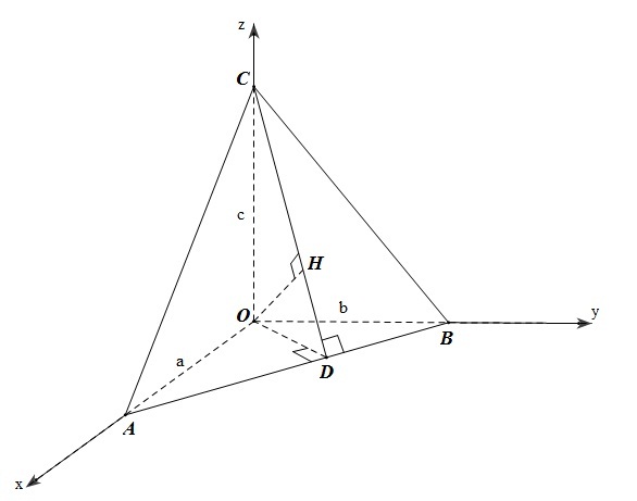 Cho tam diện ba góc vuông $Oxyz$, Trên ba cạnh $Ox, Oy, Oz$ ta lần lượt lấy các điểm $A, B, C$ sao cho $OA = a, OB = b, OC = c$. Trong đó $a, b, c$ là ba số dương. Gọi $H$ là hình chiếu vuông góc của $O$ trên $(ABC)$.