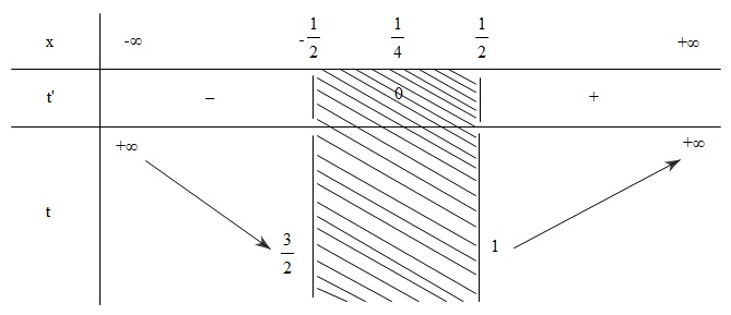 \( \Rightarrow t\) biến thiên trong khoảng \({\rm{[}}1, + \infty )\)và BPT đã cho trở thành \(\varphi \left( t \right)={t^2} - 2\left( {m - 1} \right)t + m + 1 \ge 0\left( 1 \right)\)