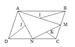 Giả sử $\overrightarrow {BM} = k\overrightarrow {BC} ,\overrightarrow {DN} = l\overrightarrow {DC} $. Đặt $X = BI \cap DC,Y = DJ \cap BC,Z = CK \cap BD$.