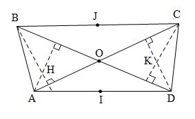 Cho tứ giác $ABCD$, hai đường chéo cắt nhau tại $O$. Gọi $H, K$ lần lượt là trung điểm của tam giác $AOB$ và $COD$; $I,J$ là trung điểm của $AD,BC$. Chứng minh $HK \bot IJ$.