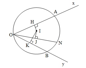 Cho góc $\widehat {xOy}$, $N$ là điểm ở trong góc. Đường tròn $(I)$ thay đổi luôn đi qua $O, N$ cắt $Ox, Oy$ tại các điểm $A, B$ (khác $O$). Chứng minh rằng trung điểm $M$ của $AB$ thuộc một đường thẳng cố định.