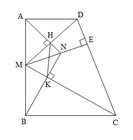 Cho hình thang $ABCD$, vuông tại $A$ và $B, M$ là trung điểm của $AB$. Các đường cao $AH, BK$ của các tam giác $AMD, BMC$ cắt nhau tại $N$. Chứng minh rằng: $MN \bot CD$.