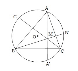 Cho tam giác $ABC$, nội tiếp đường tròn $O$; $M$ là điểm thay đổi trong $O$, $AM, BM, CM$ cắt $O$ tại $A',B',C'$. Tìm tập hợp các điểm $M$ sao cho: $\frac{MA}{MA'} + \frac{MB}{MB'} + \frac{MC}{MC'} = 3$
