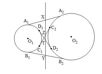 Cho hai đường tròn $(O_1),(O_2)$ ngoài nhau. $A_1A_2,B_1B_2,C_1C_2,D_1D_2$ là các tiếp tuyến chung ngoài và trong của chúng. Chứng minh rằng các trung điểm của bốn đoạn thẳng này nằm trên một đường thẳng.
