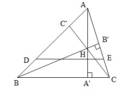 Gọi \({\rm{AA}}',BB',CC'\) là các đường cao của tam giác $ABC, H$ là trực tâm của nó . Giả sử các đường tròn đường kính $BE, CD$ là $\left( {{C_1}} \right),\left( {{C_2}} \right)$. Ta có: