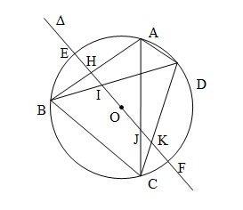 Cho tứ giác $ABCD$ nội tiếp đường tròn $(O)$. Đường thẳng $\Delta $ qua $(O)$ cắt các đoạn $AB, DB, AC, DC$ tại $H, I, J, K$. Chứng minh rằng: $OH = OK$ khi và chỉ khi $OI = OJ$.