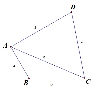 Kéo đường chéo AC của tứ giác ABCD có diên tích S và chu vi $P=a+b+c+d$ ta được hai tam giác ACD và ACB