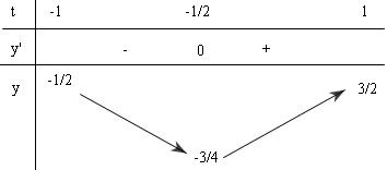 Đặt $t=sinx$ thì $t\in[-1,1]$ và $y=t^2+t-\frac{1}{2} $ có $y^/(t)=2t+1$
