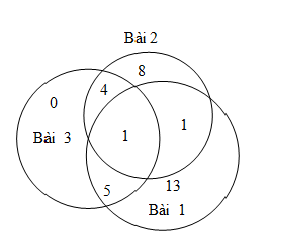 Ta biểu diễn các tập hợp như hình bên. Sau đó, trong các phần giao của tập hợp ta điền số các em giải được các bài toán một cách tương ứng. Theo đầu bài thì có đúng một em giải được cả $3$ bài. Trong phần giao chung của cả $3$ tập hợp được điền bởi số $1$. Có đúng $2$ em giải được bài thứ nhất và bài thứ hai, cho nên trong miền giao chung của bài thứ nhất và bài thứ hai và ở ngoài phần giao của cả $3$ tập hợp, ta điền số $2 - 1 = 1$. Tương tự như vậy, trong các miền còn lại cũng được điền các số tương ứng (xem hình).