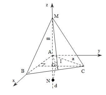 Trong tam giác $(ABC), $ vẽ $Ay\bot AB$. Chọn hẹ trục tọa độ $Axyz$ sao cho: $A(0;0;0), B(a;0;0), M(0;0;m), C(\frac{a}{2};\frac{a\sqrt{3} }{2};0 )$