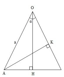 Cho $AOB$ là tam giác cân tại $O$ và có $OA=a$ và có các đường cao $OH$ và $AK$. Giải sử $\widehat{AOB}=2 \alpha $. Tính $AK, OK$ theo $a$ và $\alpha.$